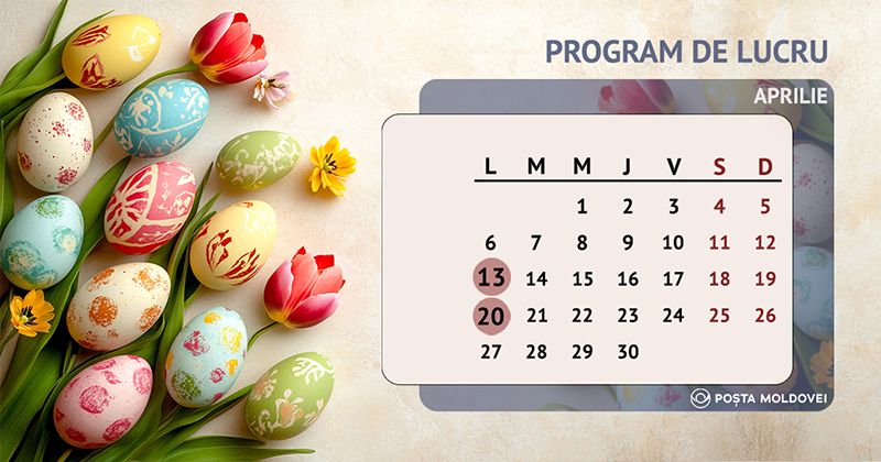 Vă informăm că zilele de 13 și 20 aprilie vor fi zile libere pentru toate oficiile și agențiile poștale ale întreprinderii.